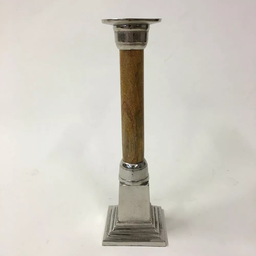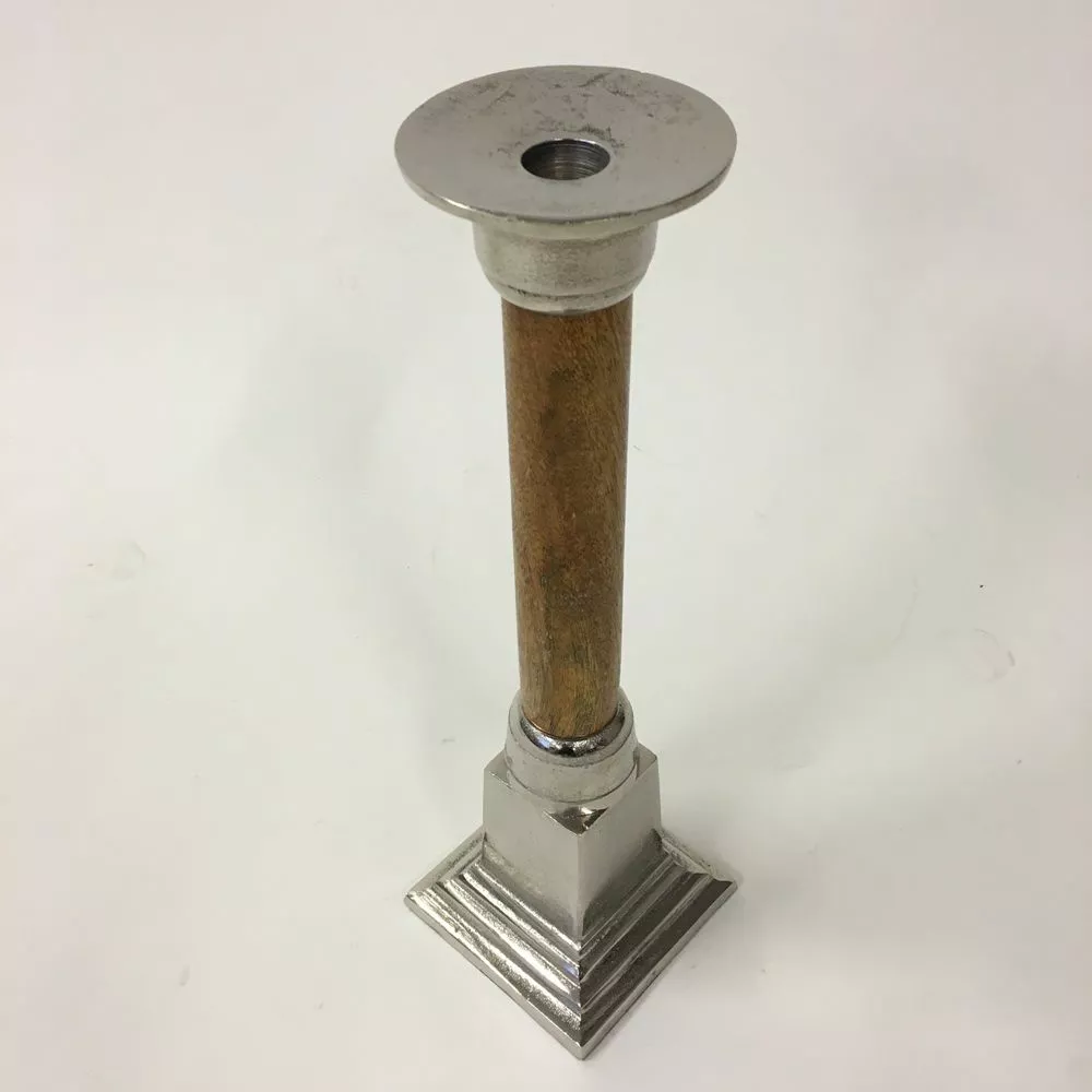 Kynttilänjalka kierrätysalumiinia ja puuta.
