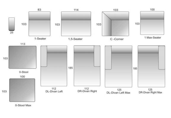 Moderni nojatuoli + moduulisohva, useita kokovaihtoehtoja ja muotovaihtoehtoja myös kahdella erilevyisellä divaanilla.