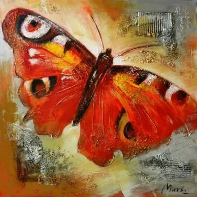 Taulu Perhonen on öljyvärimaalaus, hopeanväriset ohuet kehykset. Koko 80×80 cm
